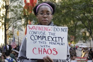 Look at that photo, she's right. Complexity is not confusion. It is confusing, and for an audience used to the highly refined sugar of bumper-sticker-politics, it's easy to dismiss Occupy. Fearing the unknown, or even the just-blurry, is easy too. In either case, the sheeple run and shy away from this oddness.